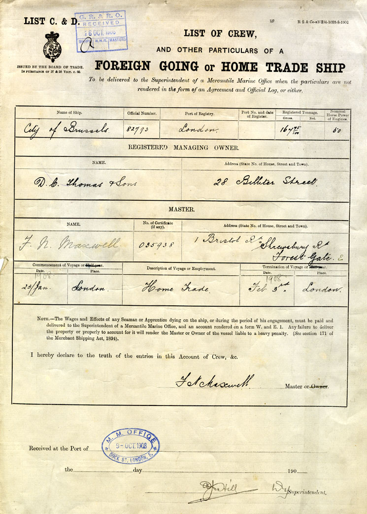 List of Crew and other particulars of a Foreign-Going or Home Trade Ship