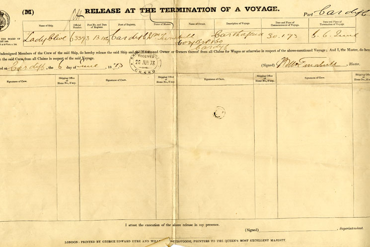 Description: The form that was signed by the crew to release the ship, the master and the owner(s) from any wage or other claims. Includes addresses of the home shipping office for each crewmember.