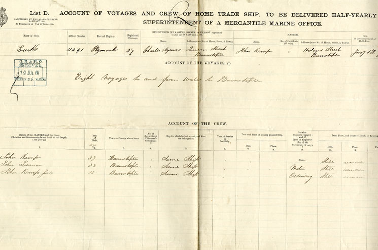 Account of Voyages and Crew of Home Trade Ship, to be delivered Half-Yearly to the Superintendent of a Mercantile Marine Office
