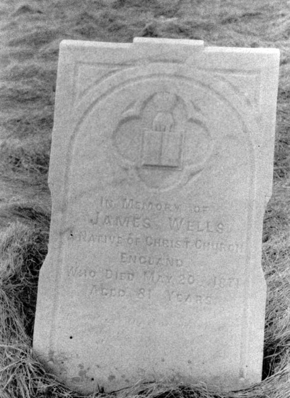 | Description: | Headstone inscription reads, "In memory of James Wells, a native of Christ Church England, who died May 20, 1871, aged 81 years." |