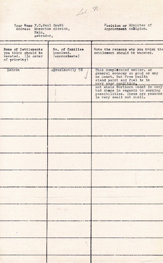 Photo Title:Information provided by F.C. Paul Grubb, Minister, Moravian Mission, Nain outlining why Hebron should be vacated