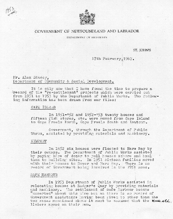 Description:Page one of a 2-page letter from A.M. Cochrane, the Assistant Deputy Minister of the Newfoundland Government, to Mr. Alec Stacey of the Department of Community and Social Development, regarding the "resettlement" projects carried out from 1951-1953 by the Department of Public Works.
