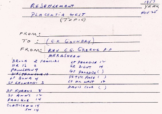 | Description: | List prepared by Rev. Greene showing communities in the Merasheen parish. Lists number of families in each community. |