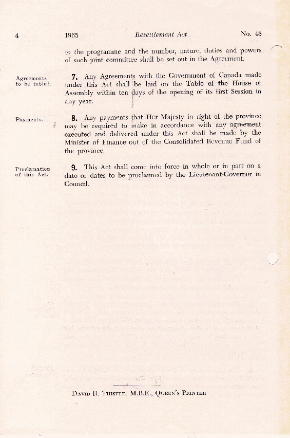 Description:Page 4 of a 4-page act to provide for the resettlement of the people in certain parts of the province [Newfoundland], April 15, 1965