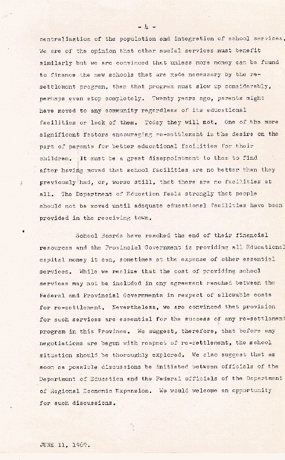 Description:Page 4 of a 5 - page report from the Newfoundland Government on the effects of resettlement on education