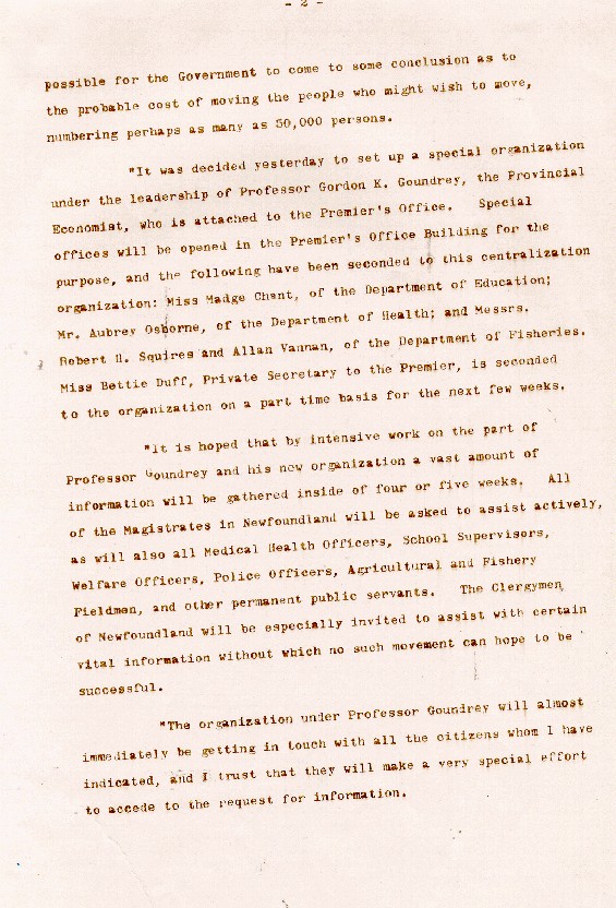 Description:Page two of a 3-page statement issued from Premier J.R. Smallwood on October 29th, 1957, regarding the Newfoundland Government gathering all the facts they need before moving ahead with a centralization program