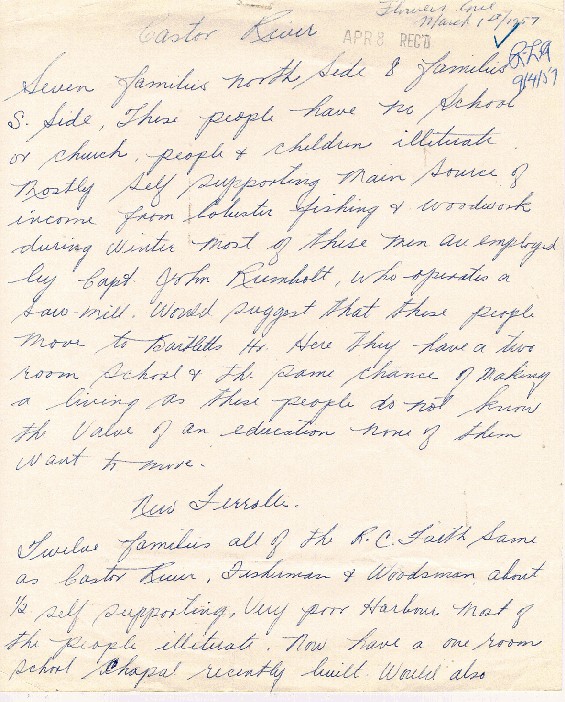 Description:Page 1 of a 3 page letter - argues for the resettlement of Castor River, New Ferrolle, Pond Cove and Current Island, and for status quo for the settlements from Eddies Cove to Sandy Cove, Newfoundland