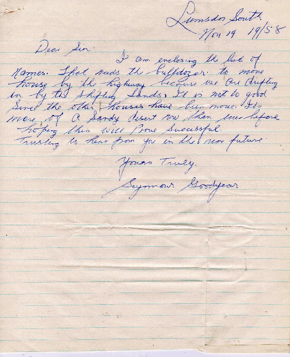 Description:Hand-written letter from Seymour Goodyear including a list of other people from Lumsden South who require use of a bulldozer to move their houses