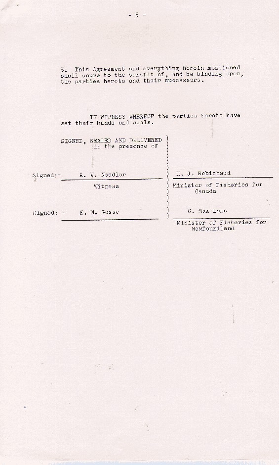 Description:Page 5 of 5 of an agreement outlining resettlement between the Provincial and Federal governments, July 1965