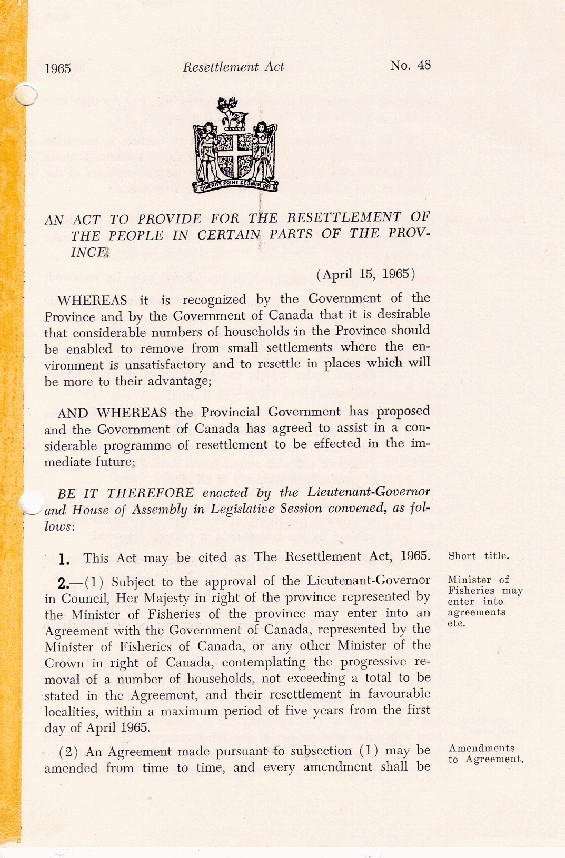 Description:Page 1 of a 4-page act to provide for the resettlement of the people in certain parts of the province [Newfoundland], April 15, 1965