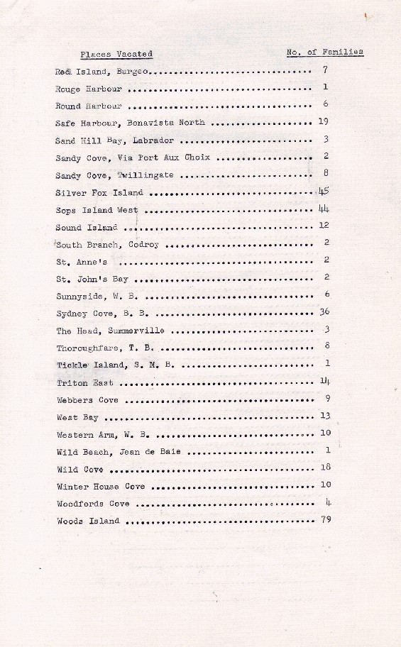 Description:Page 4 of a 4- page annual report that contains a list of Newfoundland communities that have been vacated