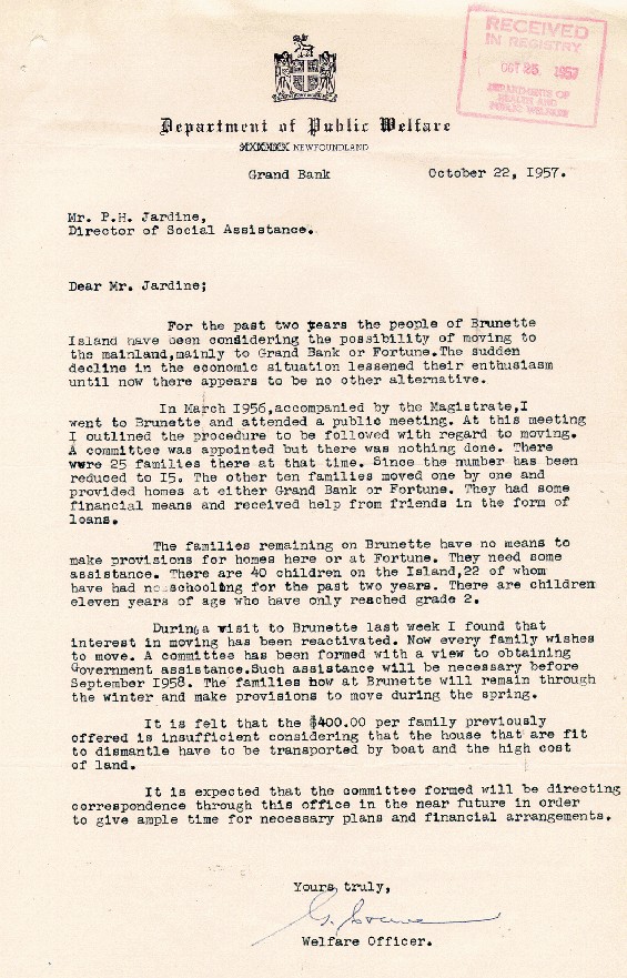 Description:Signed letter from G. Carew [?], Welfare Officer, the Department of Public Welfare to P.H. Jardine, the Director of Social Assistance in Newfoundland, regarding the possibility of moving the people of Brunette Island to Grand Bank or Fortune, Newfoundland, 22 October 1957