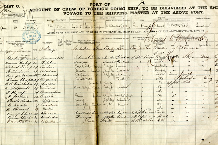 Description: A crew list filled out by the master, and kept for the voyage as the master's copy. These lists recorded one voyage.