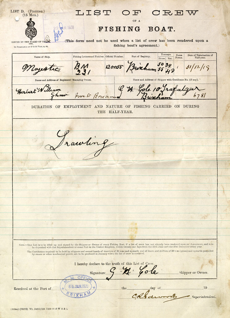Description: Includes information on the type of fishing being done and the general area where the fishing will occur, a list of crew, and accounts of apprentices, births, and deaths on board.