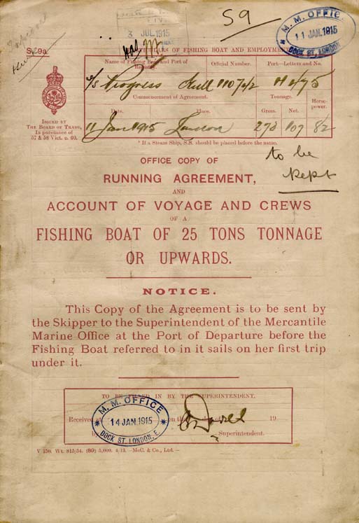 Office Copy of Running Agreement, and Account of Voyage and Crews of a fishing boat of 25 Tons Tonnage or Upwards