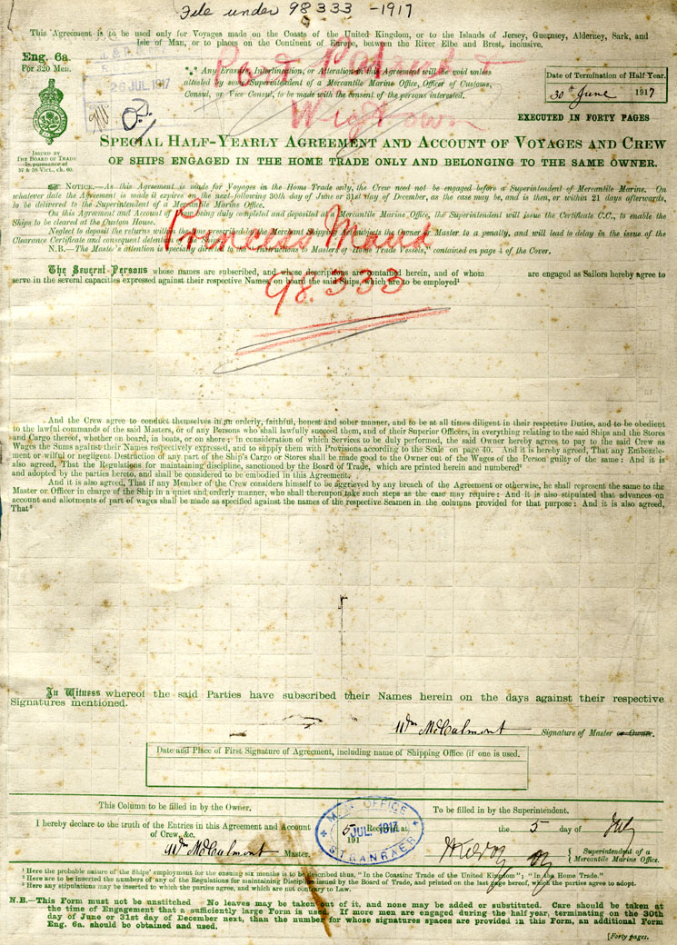 Special Half-Yearly Agreement and Account of Voyages and Crew of Ships engaged in the Home Trade only and belonging to the same Owner