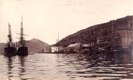 | Description: | Job Brothers & Co. south side premises in St. John's, Newfoundland, with ships in the harbour and Signal Hill in the background. |