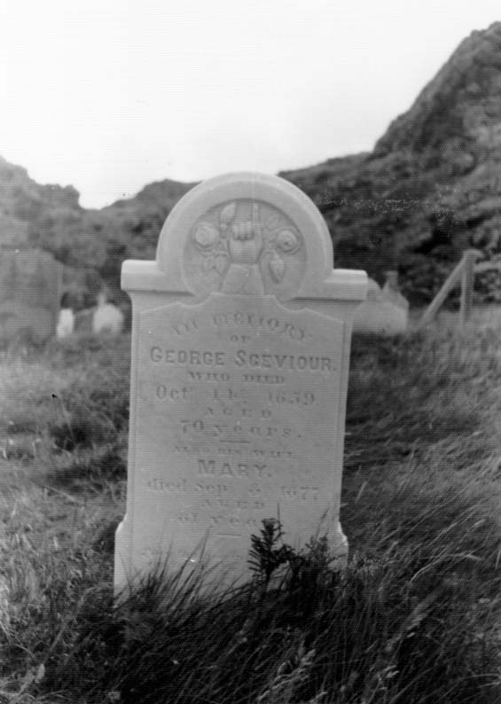 | Description: | Headstone inscription reads, "In memory of George Sceviour, who died Oct. 14th, 1859, aged 70 years. Also his wife Mary, died Sept. 6th, 1877, aged 81 years." |
