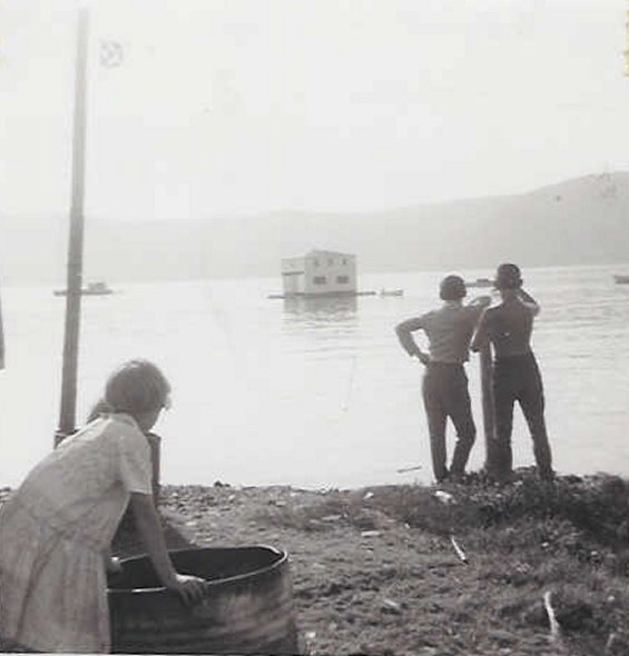 | Titre de la photo: | Maison de Mike et Hilda Symmonds, remorquée sur l'eau de NE Crouse à Conche |