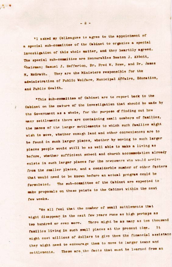 Description:Page two of a 3-page statement issued from Premier J.R. Smallwood on February 14th, 1957, regarding the possibility of a centralization and relocation of population program in Newfoundland