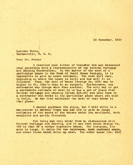 | Description: | Page one of a 2-page letter from Robert Wells, Provincial Economist, to Leander Perry of Carmanville, Notre Dame Bay, Newfoundland regarding house designs and construction |