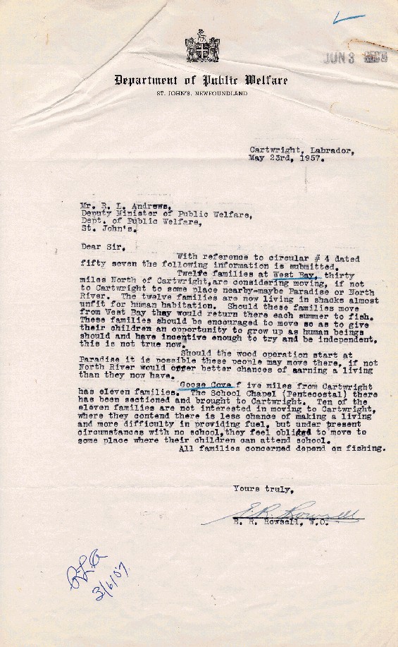 | Description: | A letter from E.R. Rowsell to R.L. Andrews regarding the movement of families at West Cove and Goose Cove in Labrador, to nearby settlements such as Cartwright, Paradise and North River |