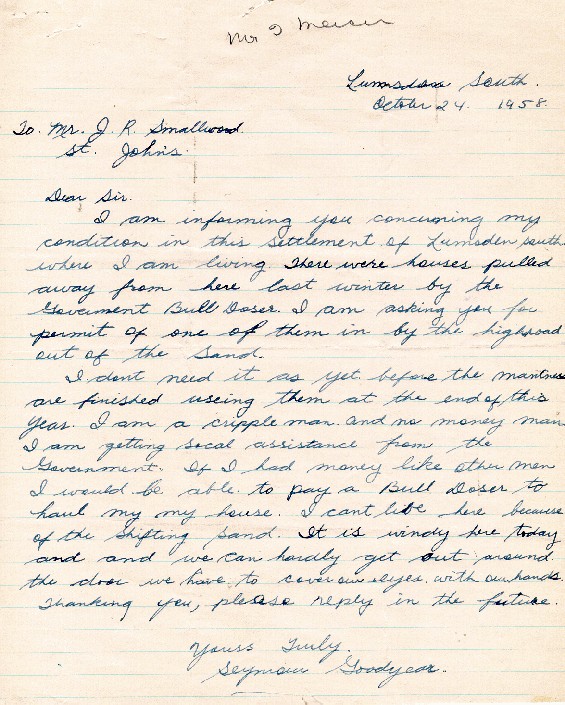 | Photo Title: | Letter from Seymour Goodyear, Lumsden South, Newfoundland to Premier J.R. Smallwood |