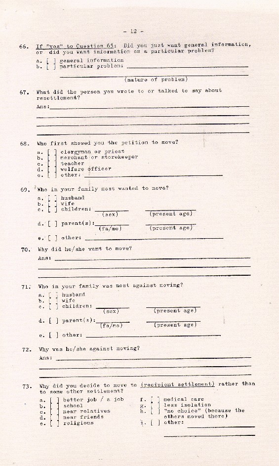 Description:Page 12 of a 19 - page Household Resettlement Questionnaire from Newfoundland, 1966
