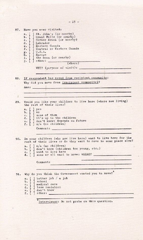 | Description: | Page 15 of a 19 - page Household Resettlement Questionnaire from Newfoundland, 1966 |