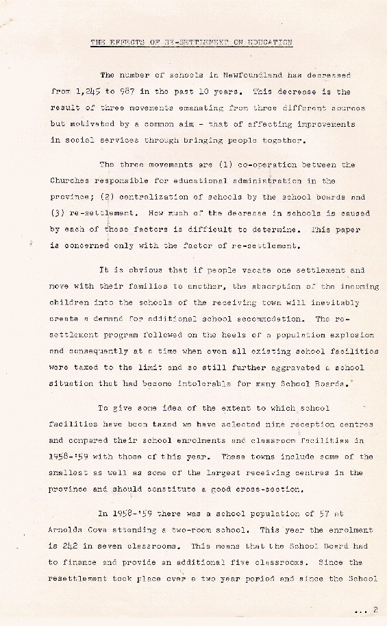 Description:Page 1 of a 5 - page report from the Newfoundland Government on the effects of resettlement on education