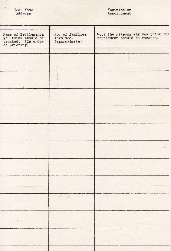 Description:Blank form used by Newfoundland Government to gather data on communities that should possibly be resettled
