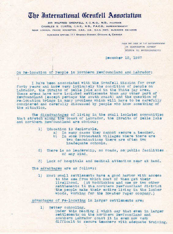 | Photo Title: | Letter from Charles S. Curtis M.D., Superintendent, International Grenfell Association regarding the relocation of people in Northern Newfoundland and Labrador |