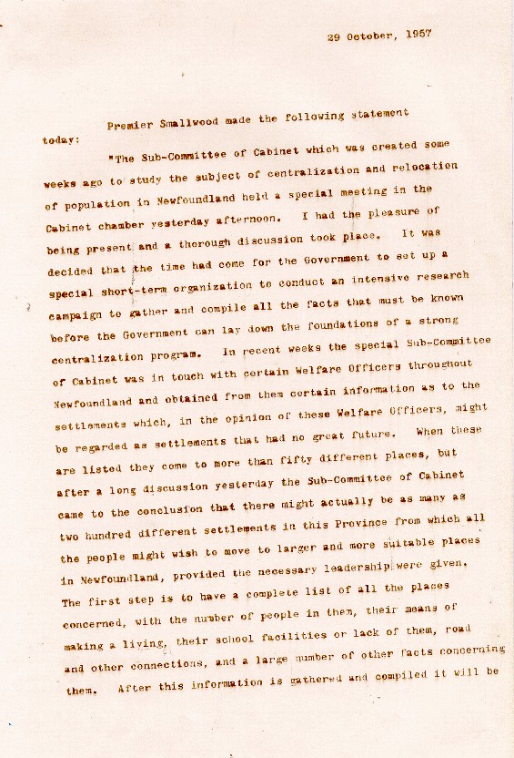 | Description: | Page one of a 3-page statement issued from Premier J.R. Smallwood on October 29th, 1957, regarding the Newfoundland Government gathering all the facts they need before moving ahead with a centralization program |