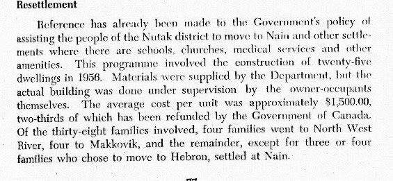 | Description: | This paragraph discusses the program in Labrador where 38 families from the Nutak district were resettled to Nain, Hebron, North West River and Makkovik |