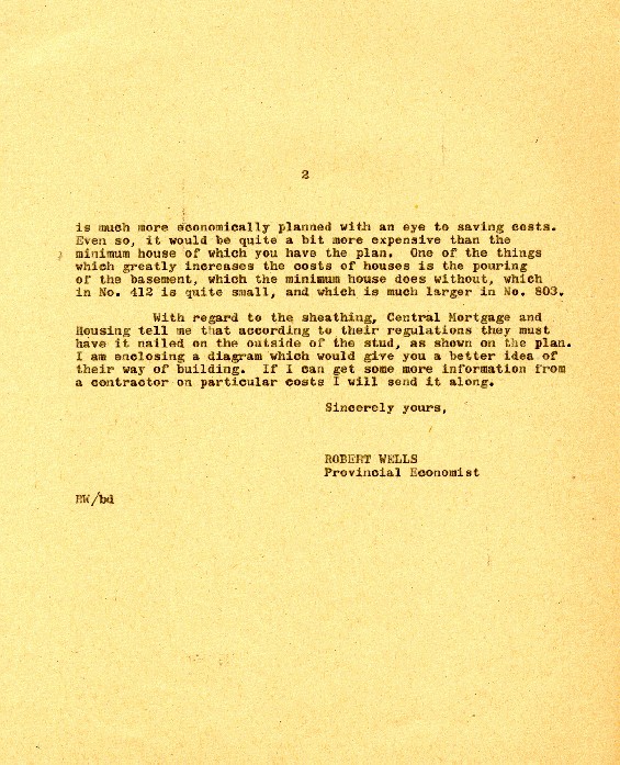 Description:Page two of a 2-page letter from Robert Wells, Provincial Economist, to Leander Perry of Carmanville, Notre Dame Bay, Newfoundland regarding house designs and construction