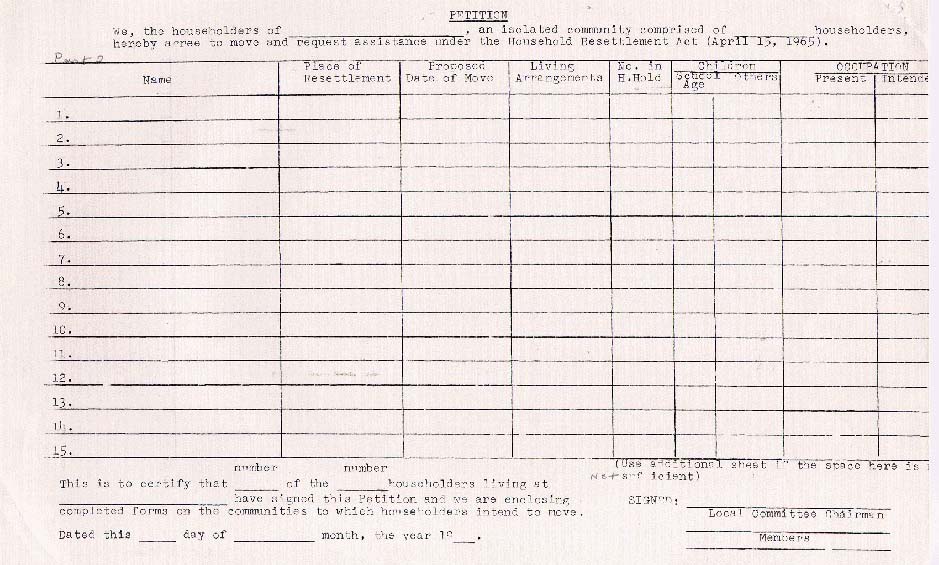 Description:A 2- part petition written by the government that had to be signed by the resettlement committee and local residents before resettlement would be funded by government.