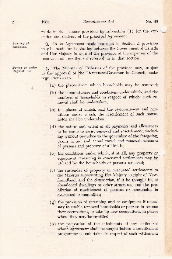 | Description: | Page 2 of a 4-page act to provide for the resettlement of the people in certain parts of the province [Newfoundland], April 15, 1965 |