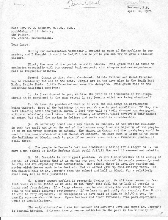 | Photo Title: | Letter to Archbishop Skinner from Rev. Denis P. Walsh regarding resettlement issues in his parish in Newfoundland |