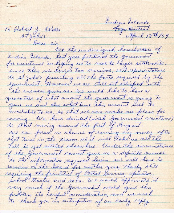 | Description: | Page 1 of a 2-page letter signed by 19 people from Indian Islands, Newfoundland stating their concerns over the financial assistance they will receive to help with their cost of relocation |