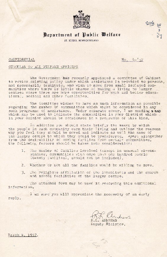 Description:A confidential circular signed by the Deputy Minister of the Department of Public Welfare, R.L. Andrews, regarding the Newfoundland Government appointing a committee to review the policy under which assistance was given to people who wished to move to a larger settlement where there were more opportunities for employment and better facilities, March 4, 1957